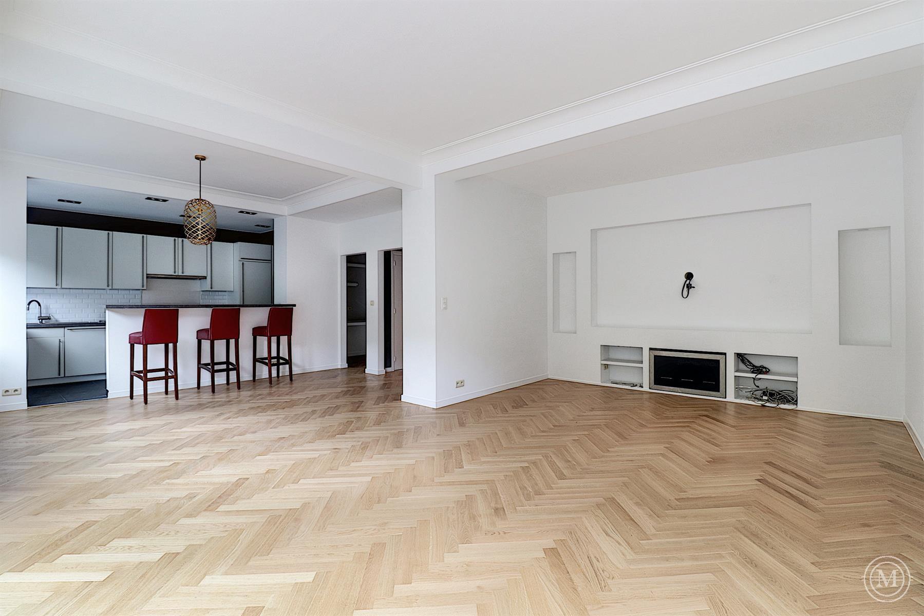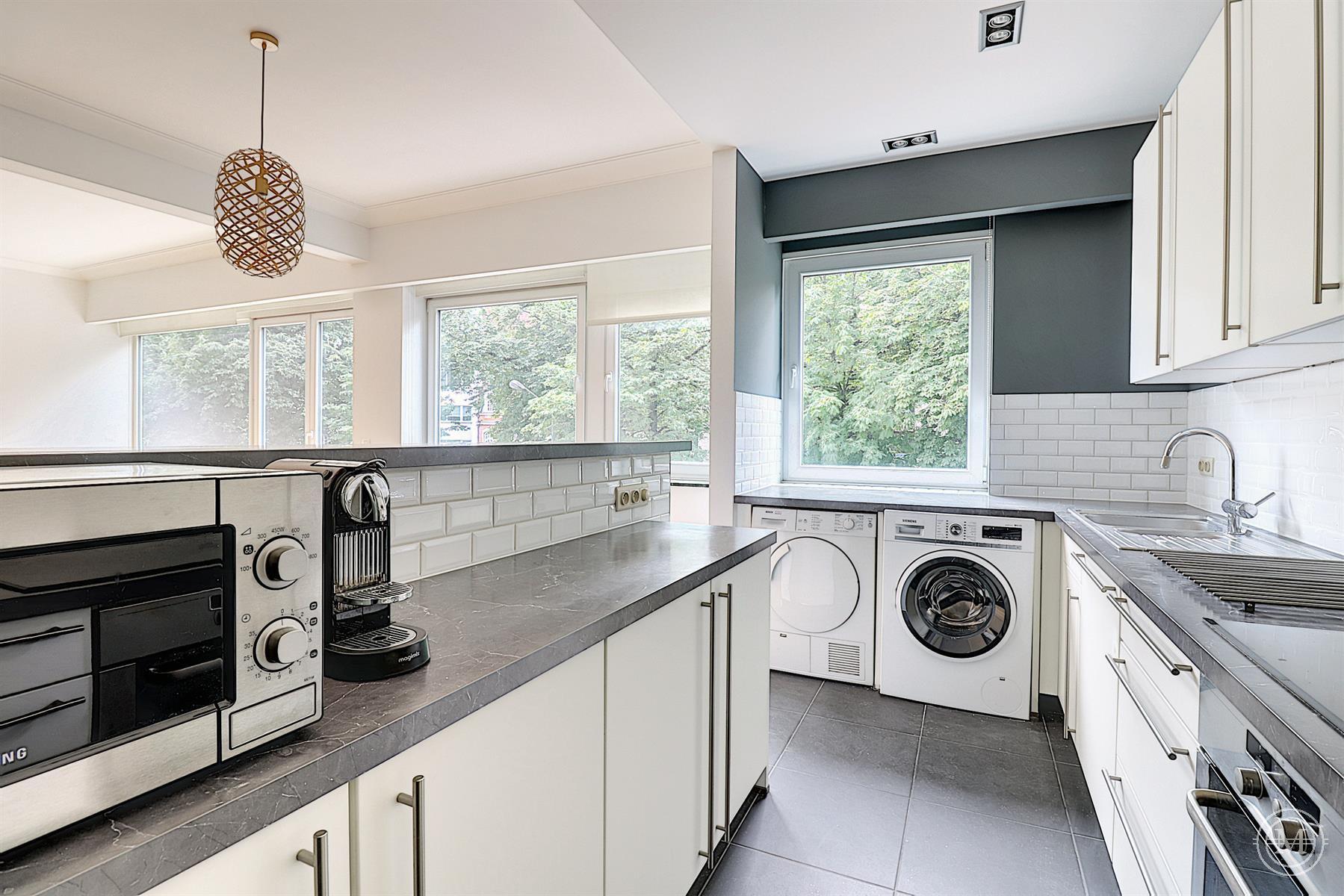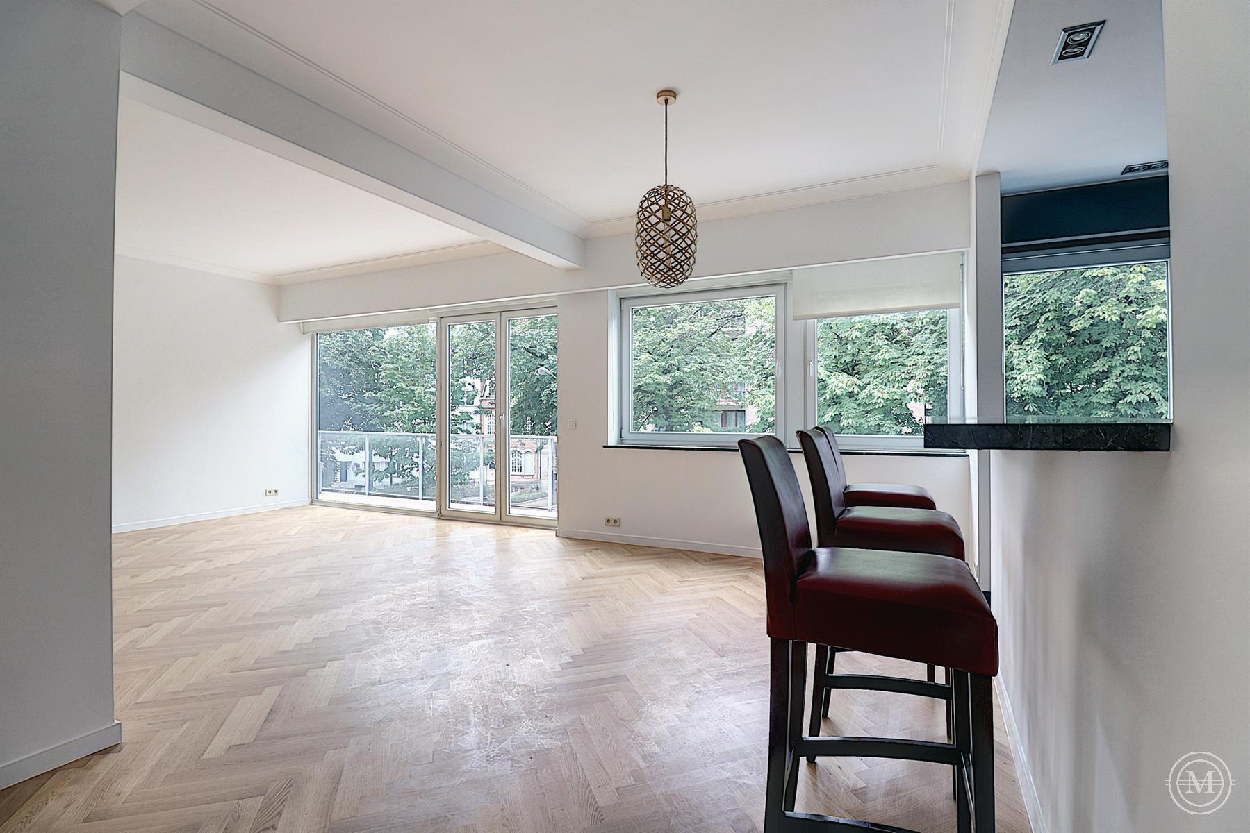 On avenue Winston Churchill, on the 2nd floor of a modern style building (1963), beautiful flat of about 108m2 with a south facing terrace and a garage. Entirely renovated, the property consists of an entrance hall with cloakroom and toilet, a living room with bay window offering a beautiful light and view on the avenue, a dining room with a fully equipped US kitchen, a small office. A night hall with built-in cupboards, leading to two bedrooms, the first with built-in cupboards, the second with custom-made furniture, a bathroom, a separate toilet. The property has a cellar and a garage in the building (option 100€). Quality renovation, oak parquet flooring, armoured door, double glazing, lift. PEB: E. Charges: 200€ (common, hot water, heating). Sought-after area, close to all amenities.