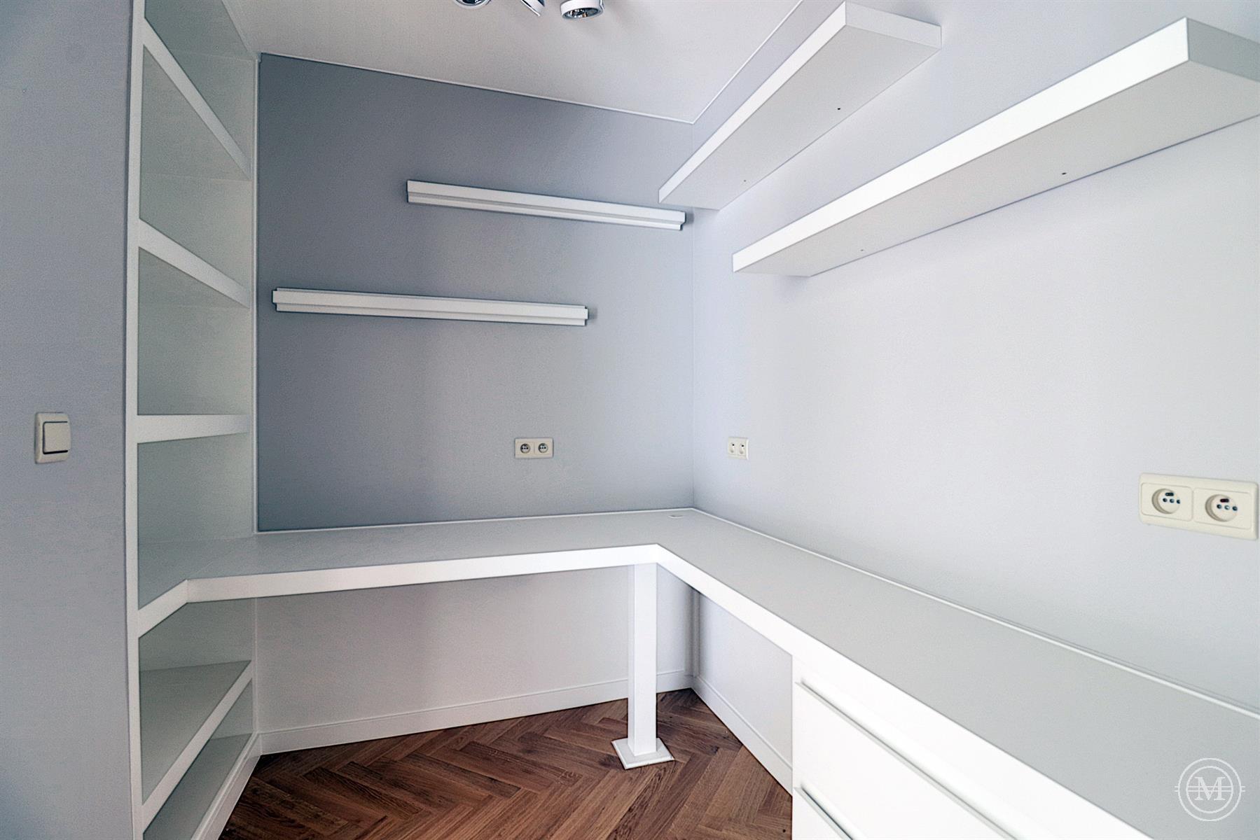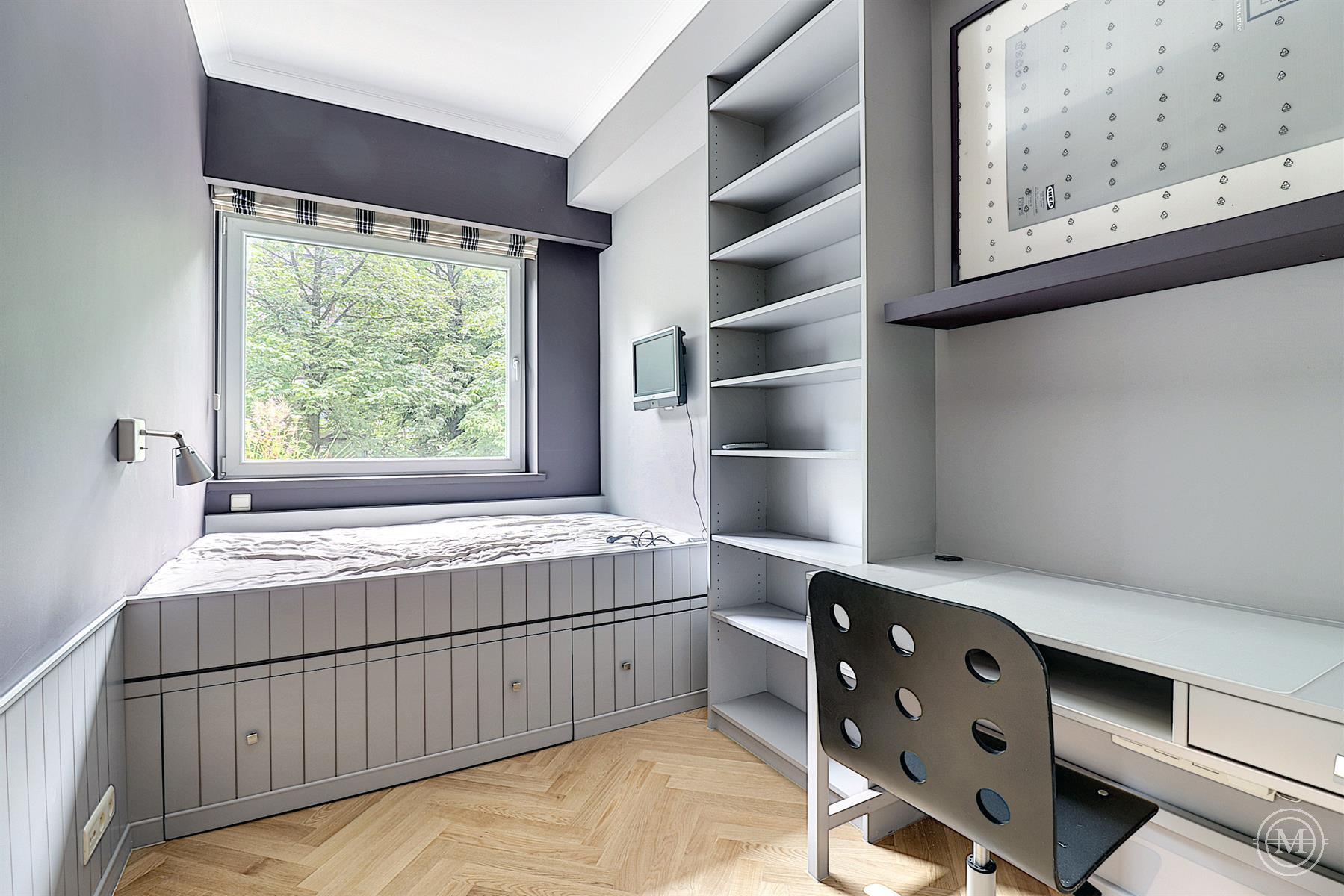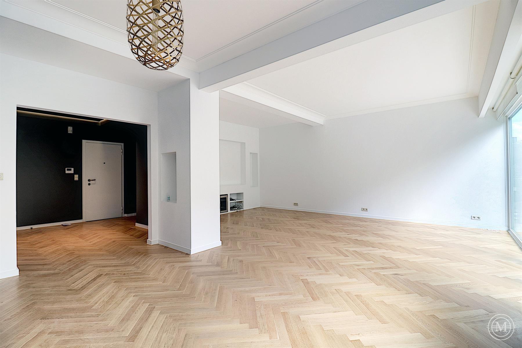 On avenue Winston Churchill, on the 2nd floor of a modern style building (1963), beautiful flat of about 108m2 with a south facing terrace and a garage. Entirely renovated, the property consists of an entrance hall with cloakroom and toilet, a living room with bay window offering a beautiful light and view on the avenue, a dining room with a fully equipped US kitchen, a small office. A night hall with built-in cupboards, leading to two bedrooms, the first with built-in cupboards, the second with custom-made furniture, a bathroom, a separate toilet. The property has a cellar and a garage in the building (option 100€). Quality renovation, oak parquet flooring, armoured door, double glazing, lift. PEB: E. Charges: 200€ (common, hot water, heating). Sought-after area, close to all amenities.