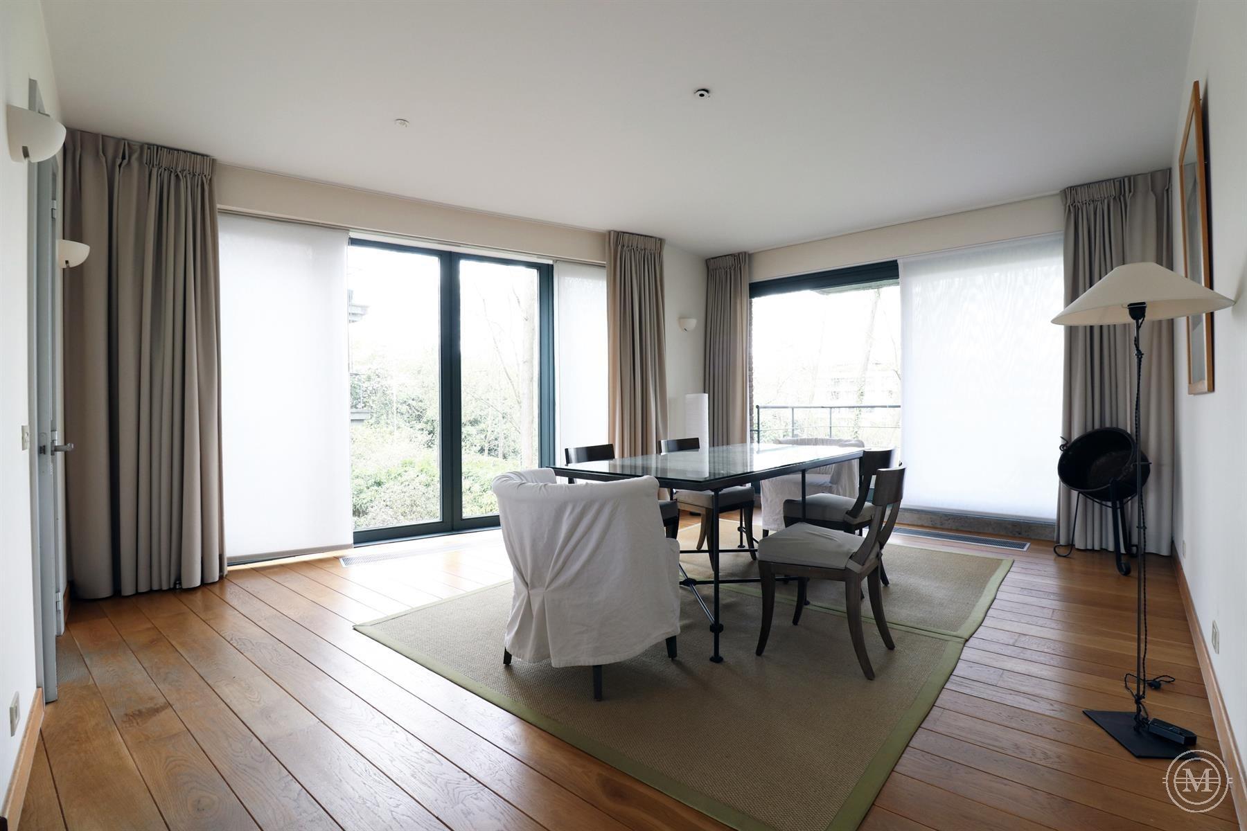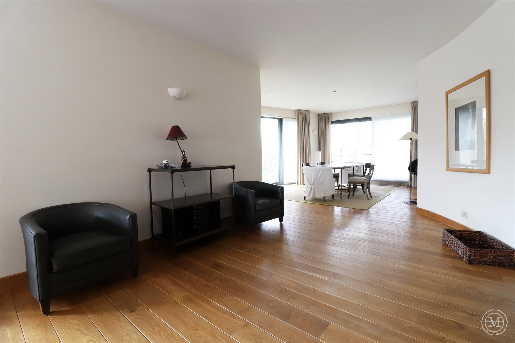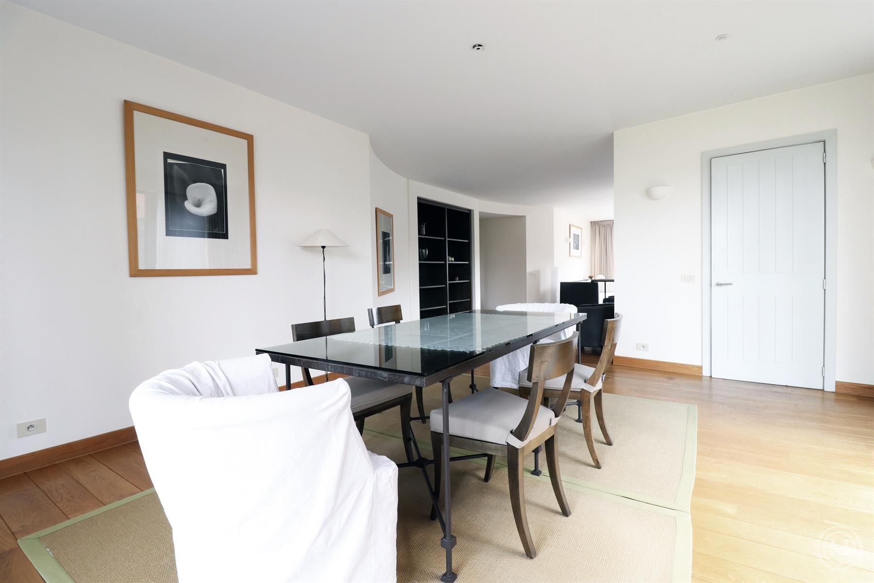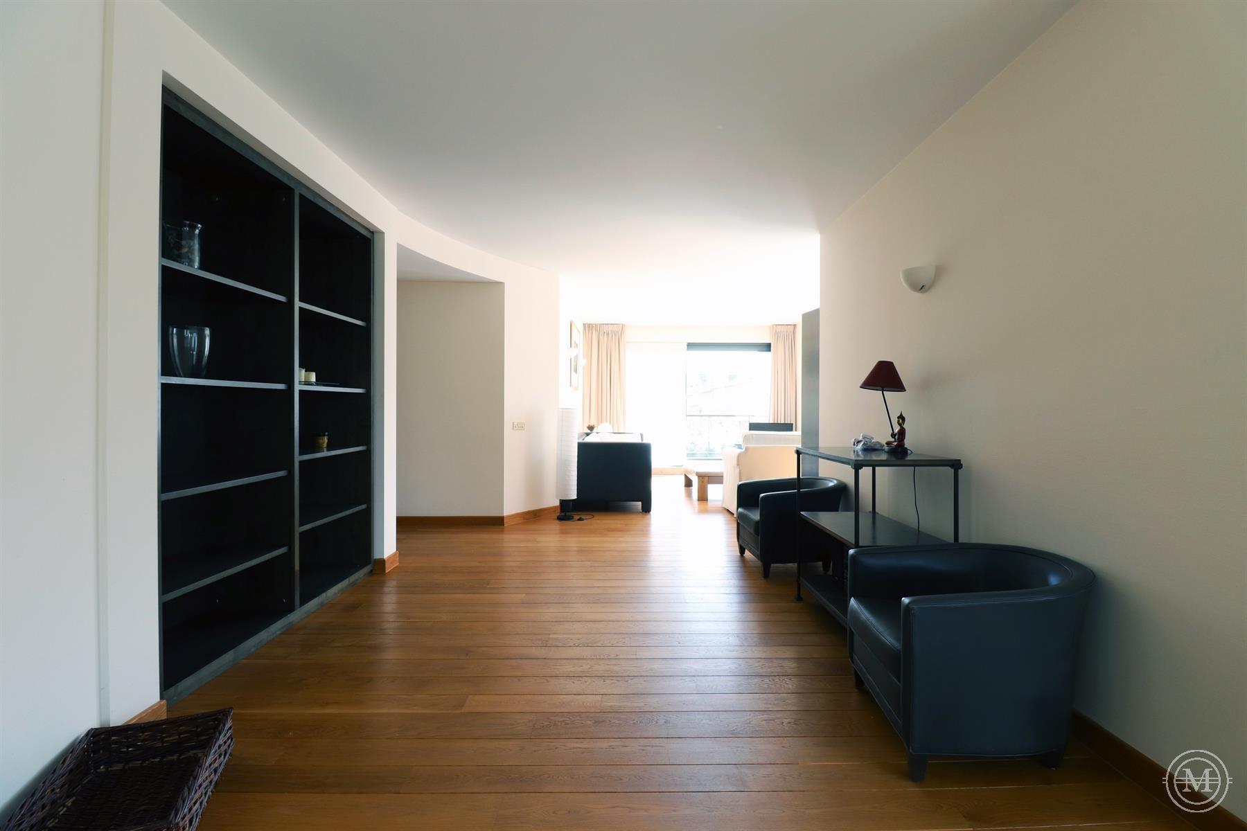 In a quiet area near Tomberg, beautiful furnished apartment of approximately 120m² located on the 1st floor of a 1992 building. The property consists of an entrance hall with cloakroom and wc, a large living room with terrace, a dining room with terrace (view on the park), an equipped kitchen, a large bedroom with bathroom/wc, a bedroom with shower. Cellar and garage (included). Quality furniture and finishes, solid wood flooring, numerous cupboards. Electric heating, double glazing, reinforced door, video intercom, washing machine. Elevator, bike room, concierge. Close to shops and transport. PEB: F. Monthly costs: 180€ (water, common areas, concierge).