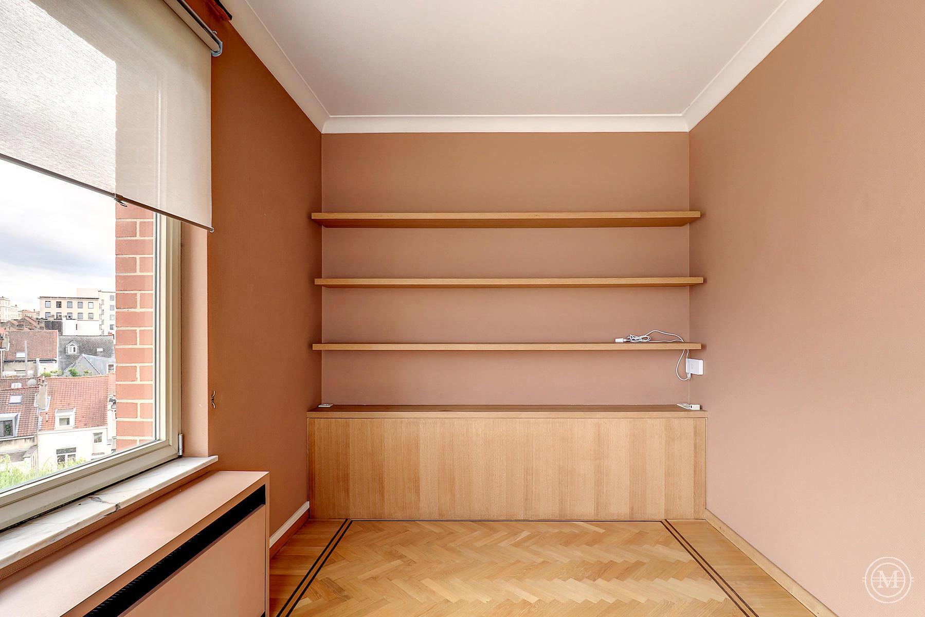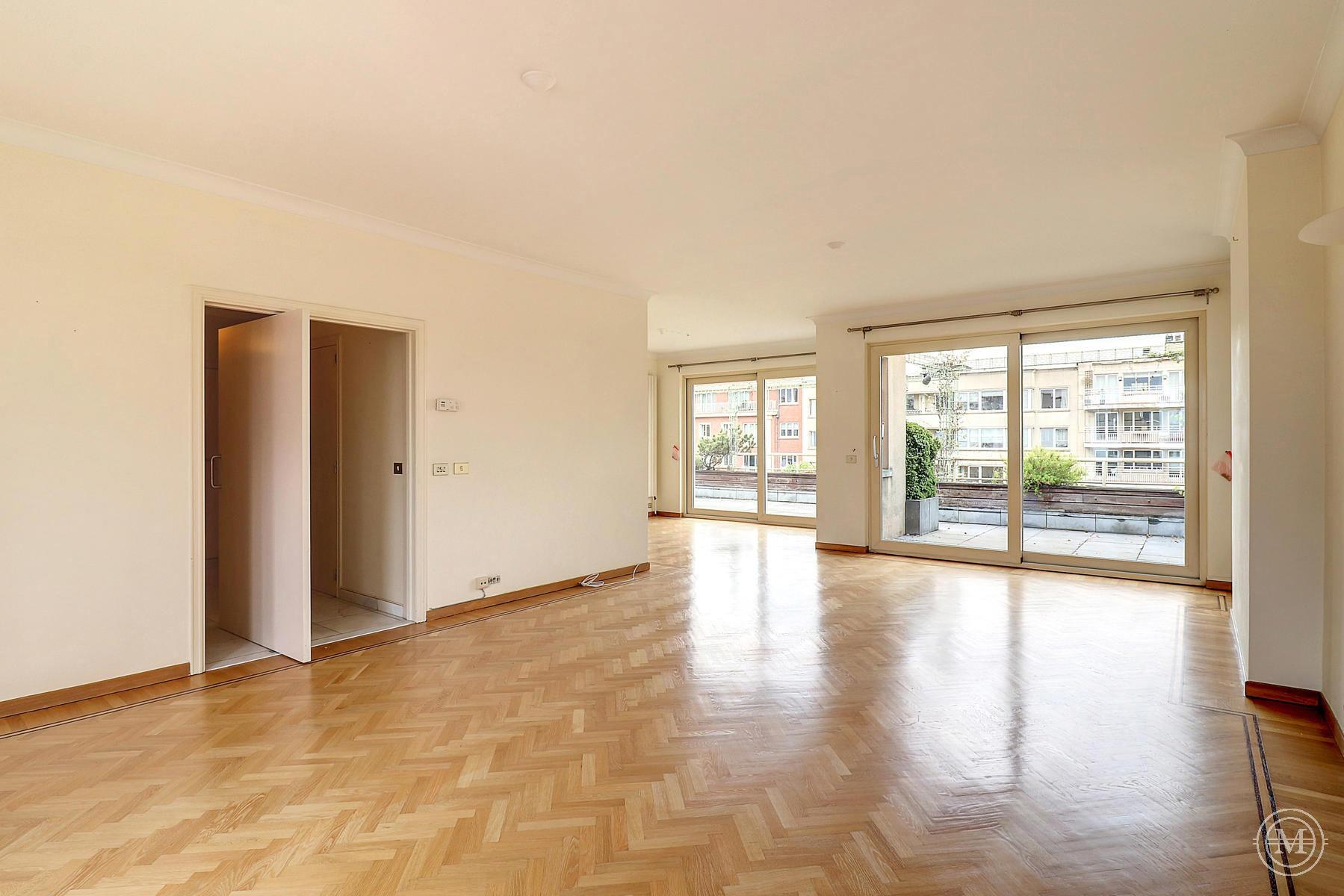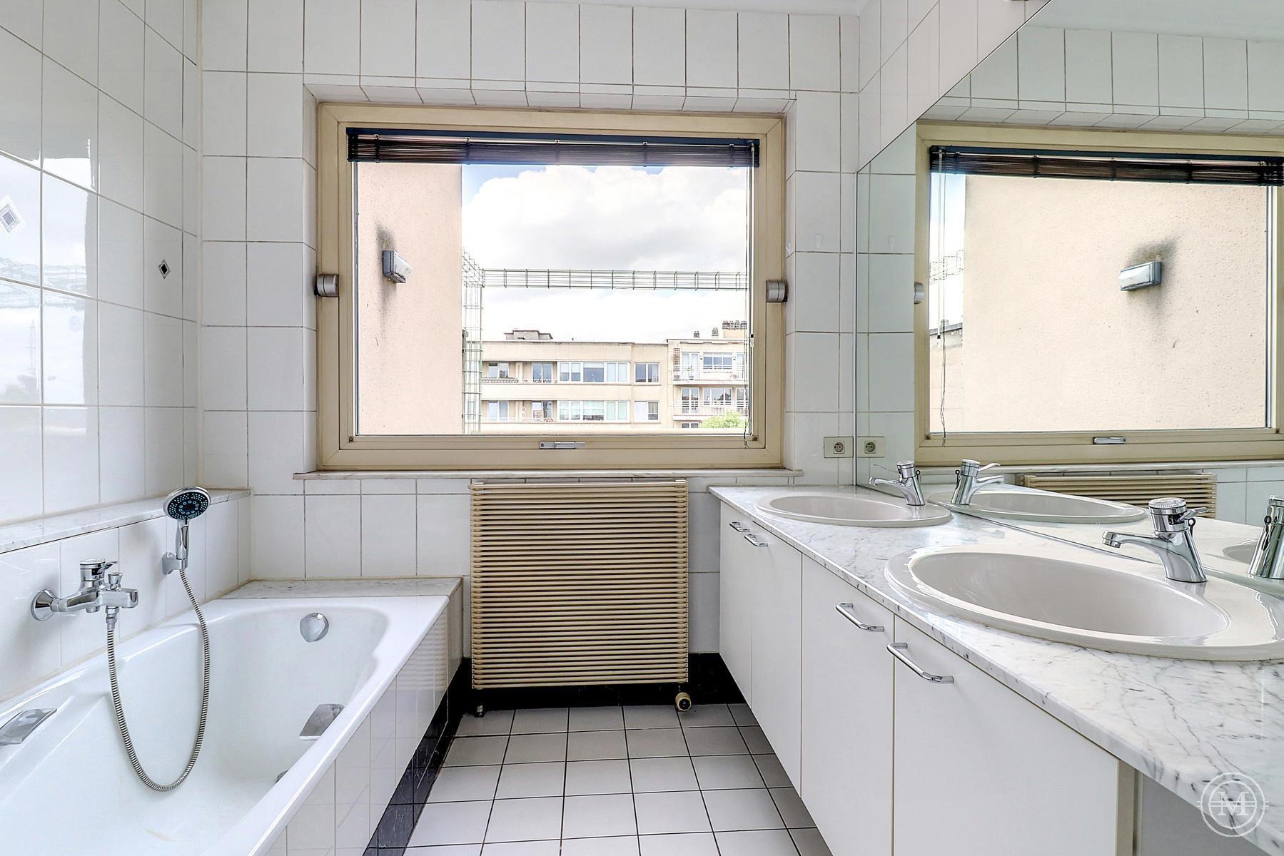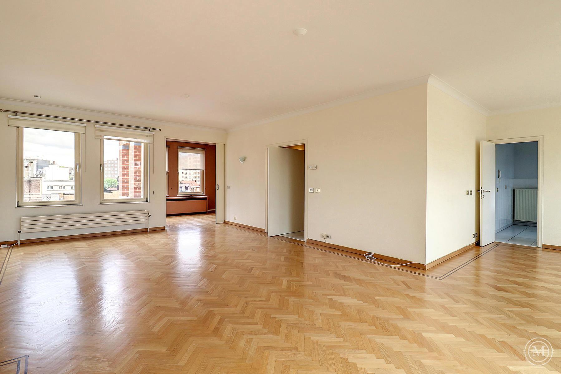 Meert-Realty is verheugd u dit ruime penthouse van ongeveer 160m2 aan te bieden, gelegen op een paar meter afstand van Square Maréchal Montgomery. Deze uitzonderlijke woning ontwikkelt zich op de 6e (bovenste) verdieping van een gebouw uit de jaren ‘90 en geniet van een prachtig terras met uitzicht van meer dan 50m2 dat toegankelijk is vanuit de woonkamer. Het bestaat uit een eigen inkomhal uitgerust met een vestiaire en een gastentoilet, een uitgeruste keuken, een wasruimte, een woonkamer met royale volumes in massief parket, een kantoorruimte met een schuifdeur, een en-suite slaapkamer met dressing en aparte badkamer/douche/apart toilet (40m2), een tweede slaapkamer met inbouwkasten en een doucheruimte met toilet (17m2). Een kelder en een parkeerplaats in de kelder zijn bij de prijs inbegrepen. Mogelijkheid tot aankoop van een afgesloten garagebox tegen meerprijs (35.000€). PEB E, dubbele beglazing, collectieve verwarming op gas, gepantserde deur, videofoon en nabij alle voorzieningen!